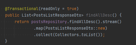 @transactional(readonly = true)를 추가해줬는데 readOnly 부분이 빨간색이 뜨면서 오류가 떴다